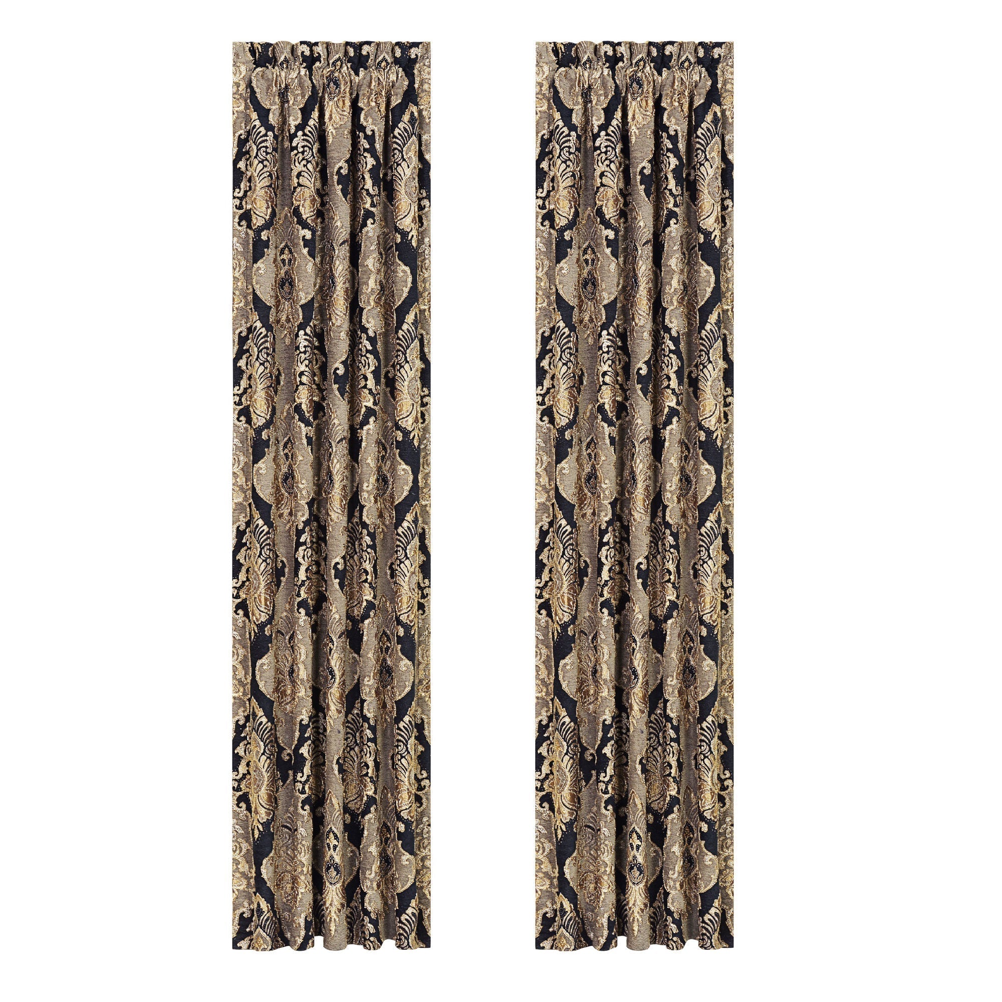 These elegant woven chenille damask window panel pairs are custom cut by pattern, contain an opaque white lining and include coordinating tiebacks.