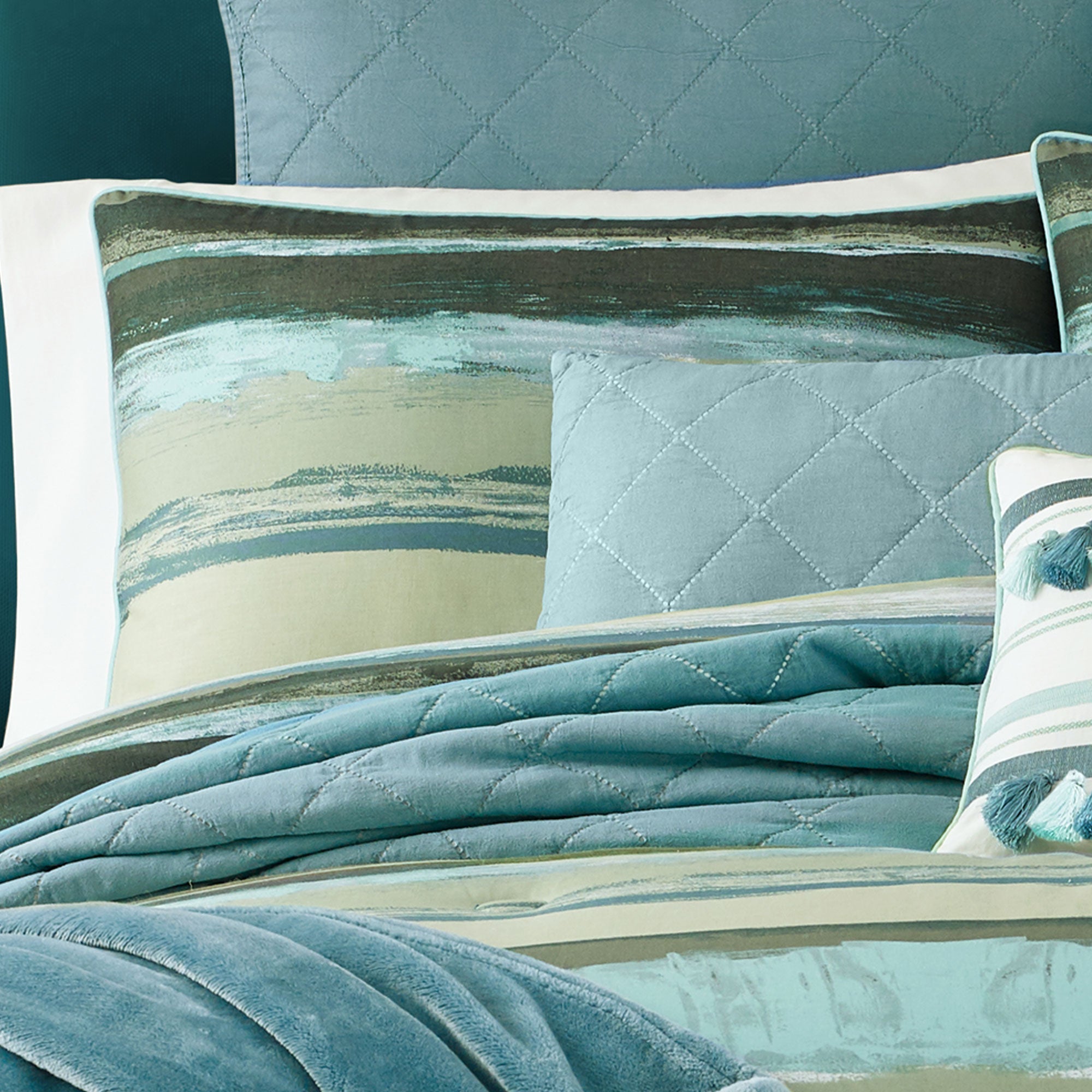 Let turquoise, green and teal hues wash over you with the Cordoba Forest watercolor stripe comforter set from J by J. Queen New York. Cordoba Forest bedding brings an artistic flair to your sleep space with vivid horizontal watercolor stripes. Printed on soft 100% cotton, this cozy comforted will brighten any bedroom. The comforter is generously oversized and overfilled with a coordinating solid reverse. Layer in the Oakland solid coverlet in ivory or teal to complete your look.