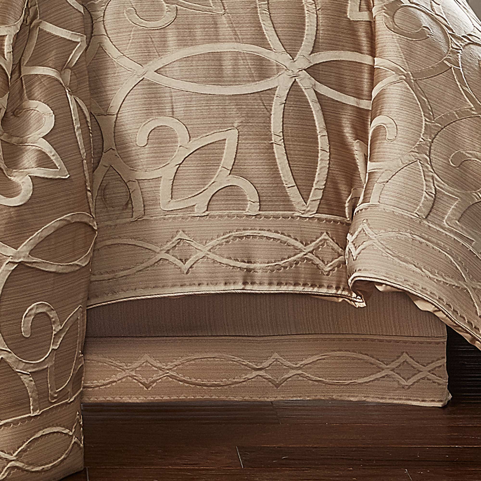 The Decade 4 Piece Comforter Set Collection Features A Highly Constructed Sleek Engineered Jacquard With Bordered Edges. This Alluring Modern Geometric Motif Is Constructed With A Puff Technique Which Sits On A Lustrous Stria Satin Ground In Elgant Gold Tones. This Comforter Is Generously Oversized And Overfilled For A Sophisticated Look. The Matching Hidden Zipper Closure Pillow Shams Are Engineered With A Sleek Border Showcasing The Geometric Motif. The Bedskirt Has Extra Length And Is Constructed With A Split Corner Tailored Finish And The Coordinating Stria Satin Is Bordered With A Geometric Puff Jacquard Finish. Coordinate Decade Accent Pillows, Shams, And Window Treatments By J. Queen New York Are Available Separately.