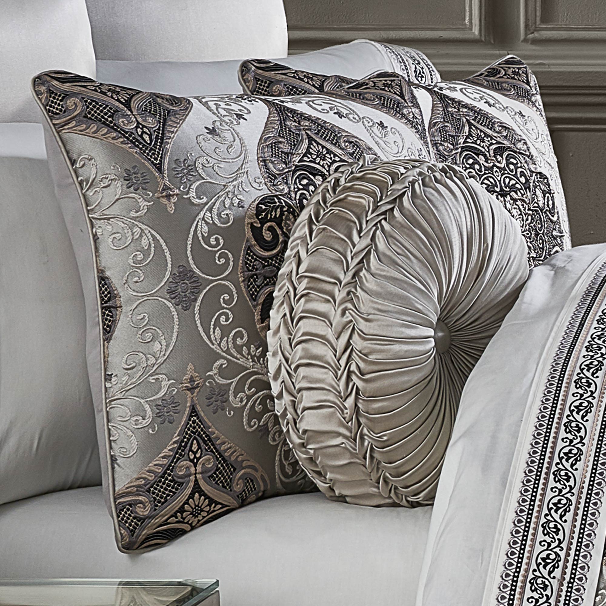The Desiree 4 Piece Comforter Set Bedding Collection Is Exquisite With Its Fine Details And Bold Use Of Black And Silver Tones. This Beautiful Woven Jacquard Damask Pattern Is Rich With Its 3-Dimensional Weave And Satin Finish. Paired With Matching Hidden Zipper Pillow Shams And A Silver Satin Split Corner Bedskirt, This Oversized Ensemble Will Add Sophisticated Elegance To Your Bedroom Decor. The Reverse Of This Set Is A Soft Microfiber Dyed To Match The Silver Base Of The Pattern On The Front. Finished With A 1/4″ Silver Piping. Pair This Bedding Collection With The Desiree Throw Pillows, Shams, And Window Treatments For A Complete Luxury Look.