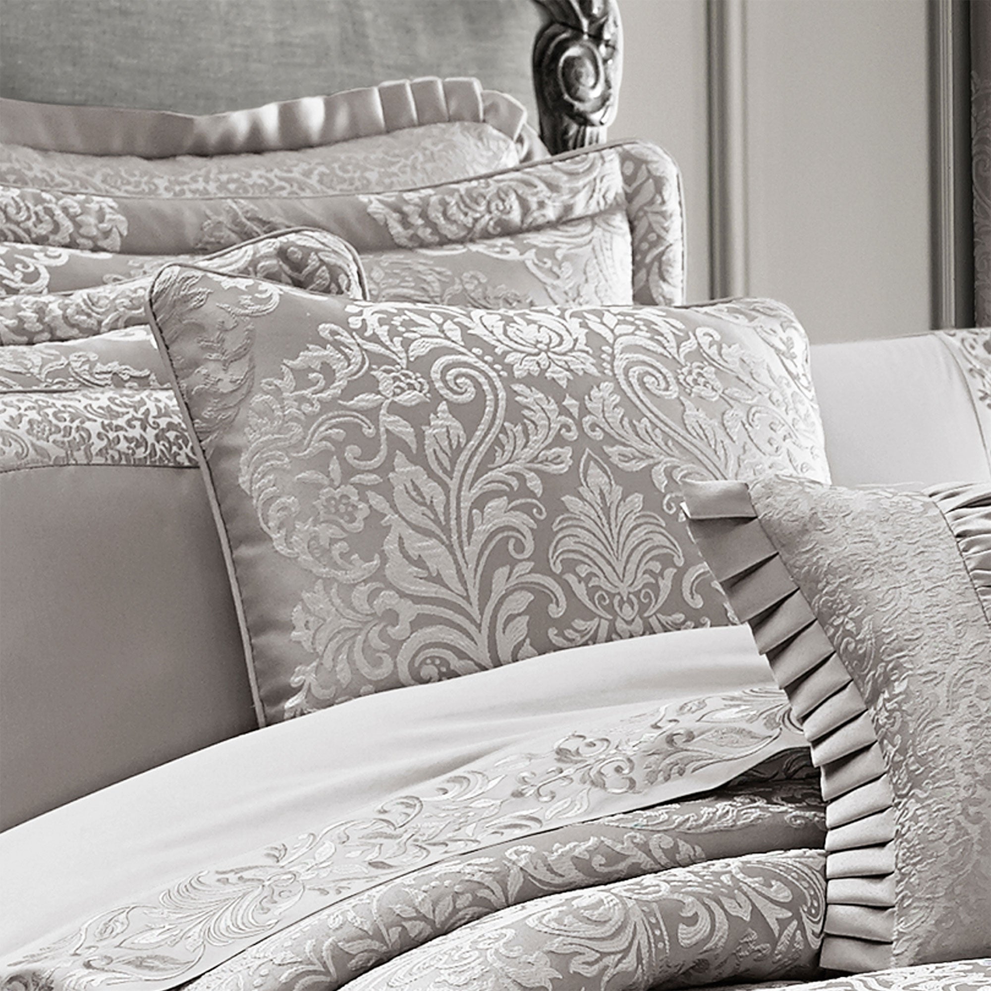 Grand scale opulence in rich tone of silver, pewter, and platinum. The large scale ornate damasks set the stage for dramatic decorating. The comforter has been carefully cut and sewn to ensure that the intricate design is always perfectly centered. Giving the ensemble a custom look a unique finishing process gives the fabric a relaxed and three dimensional texture.
