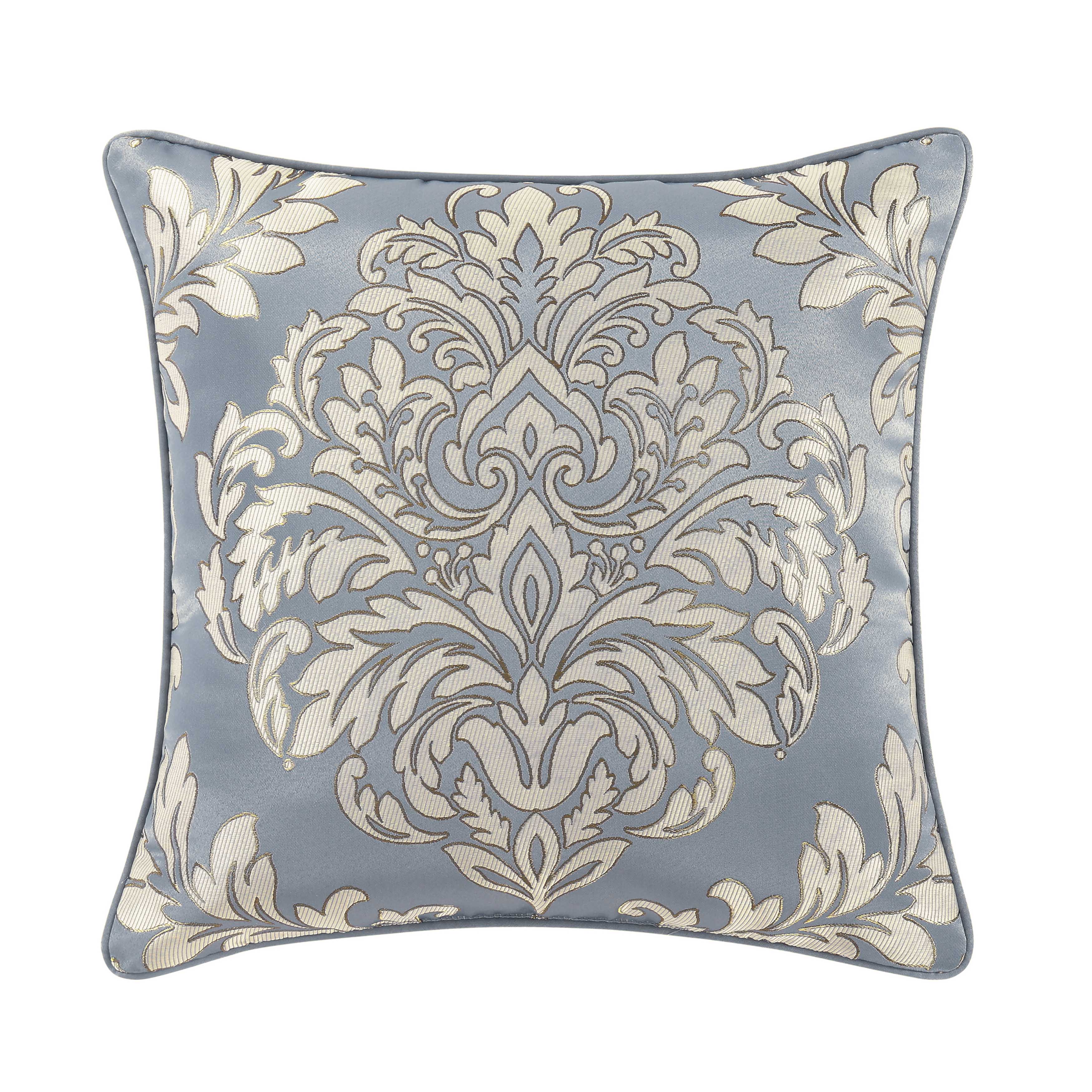 The lorenzo 20 inch decorative throw pillow features a sophisticated woven damask in cream tones against a soothing soft blue satin backdrop. The reverse is made with a woven damask stripe design, making it a perfect multi-use addition the lorenzo comforter set.