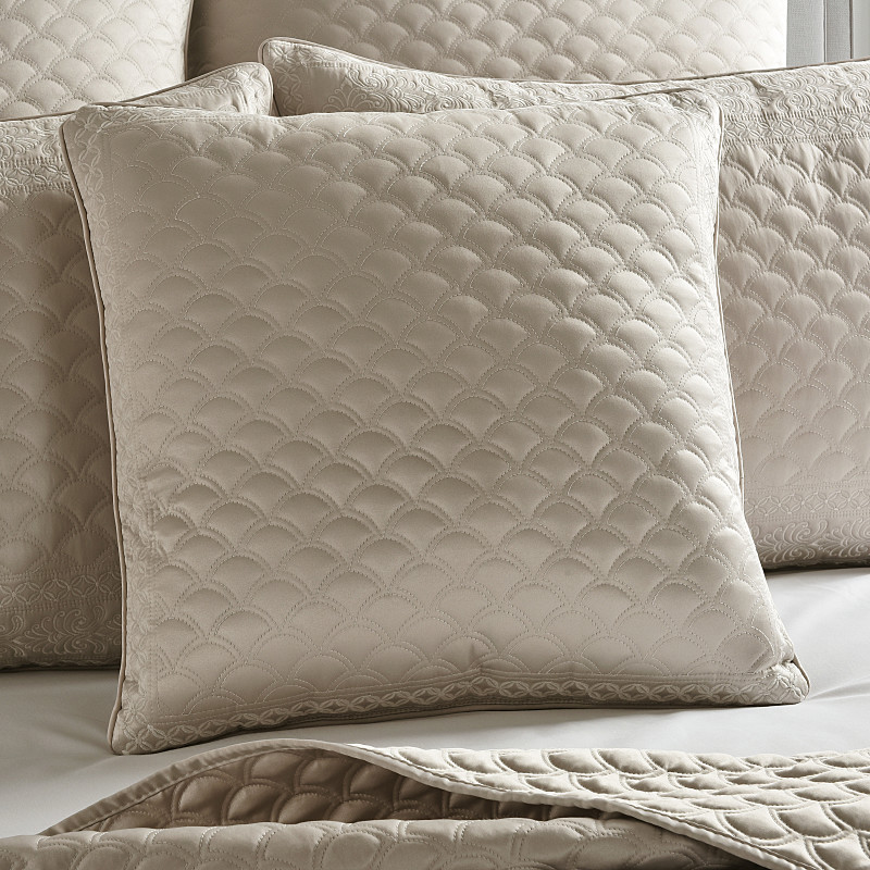 The Lyndon 20 Inch Decorative Throw Pillow is a direct coordinate to the Lyndon Coverlet. It contains a stunning matte satin fabric, machine quilted and bordered with a timeless foulard embroidery and accented with 1/4″ satin piping for a fine finish.