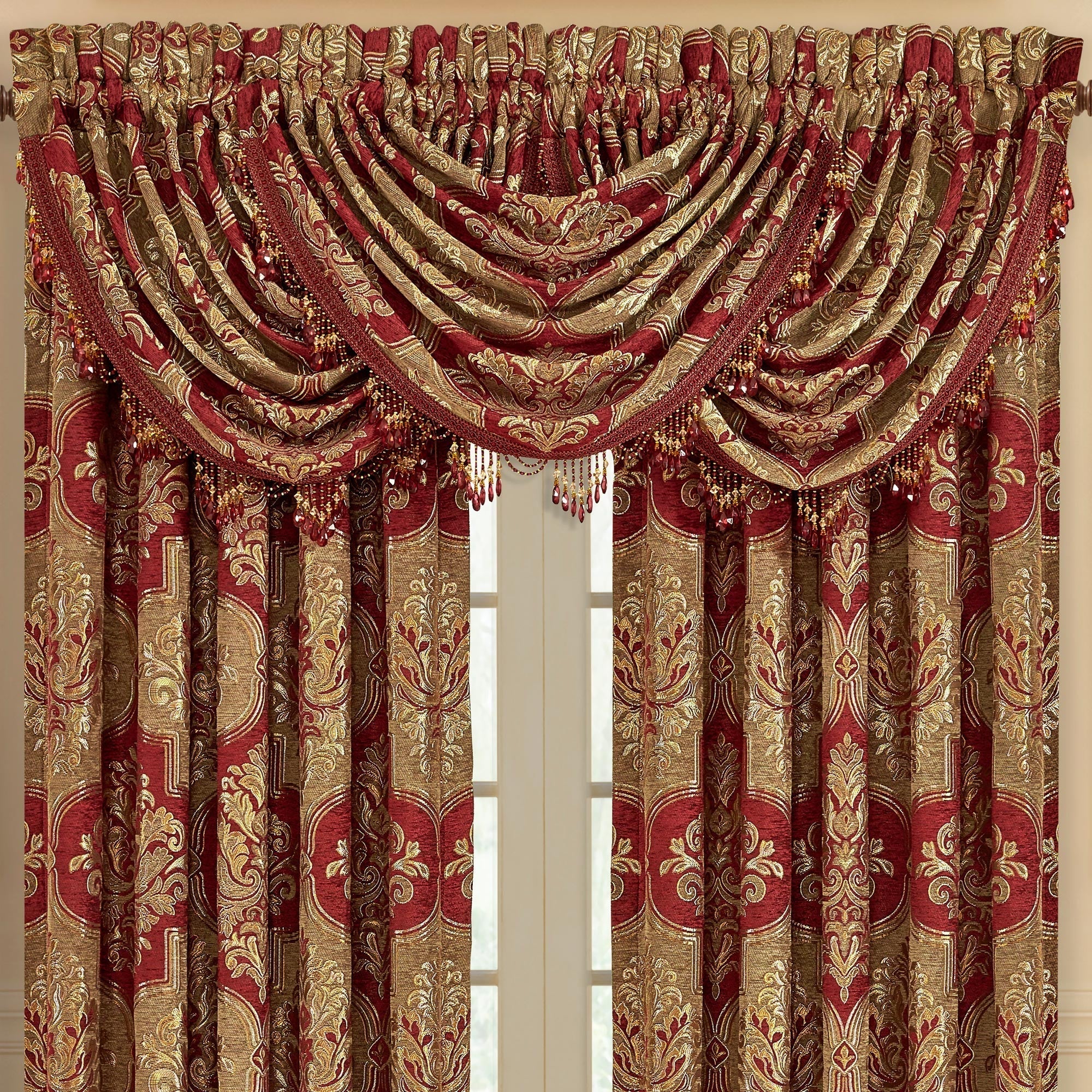 This elegant waterfall valance is made of the same woven damask fabric as the panels. These are trimmed with a crystal fringe.