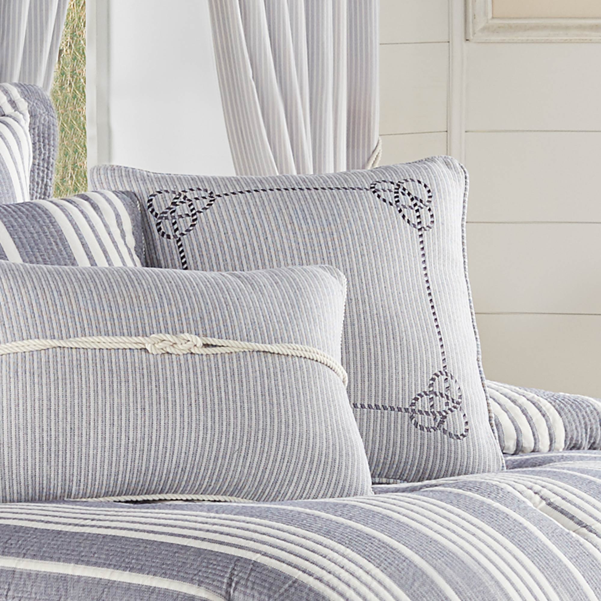 The Shore 18 Inch Decorative Throw Pillow Is Constructed With A Cotton/Poly Yarn Dye Stripe And A Sailor’S Knot Rope Embroidery In A Square Formation For A Tasteful Nautical Appeal. This Beautiful Pillow Is The Perfect Accent Piece Addition To The J. Queen New York Shore Coastal Bedding And Window Treatment Collection.